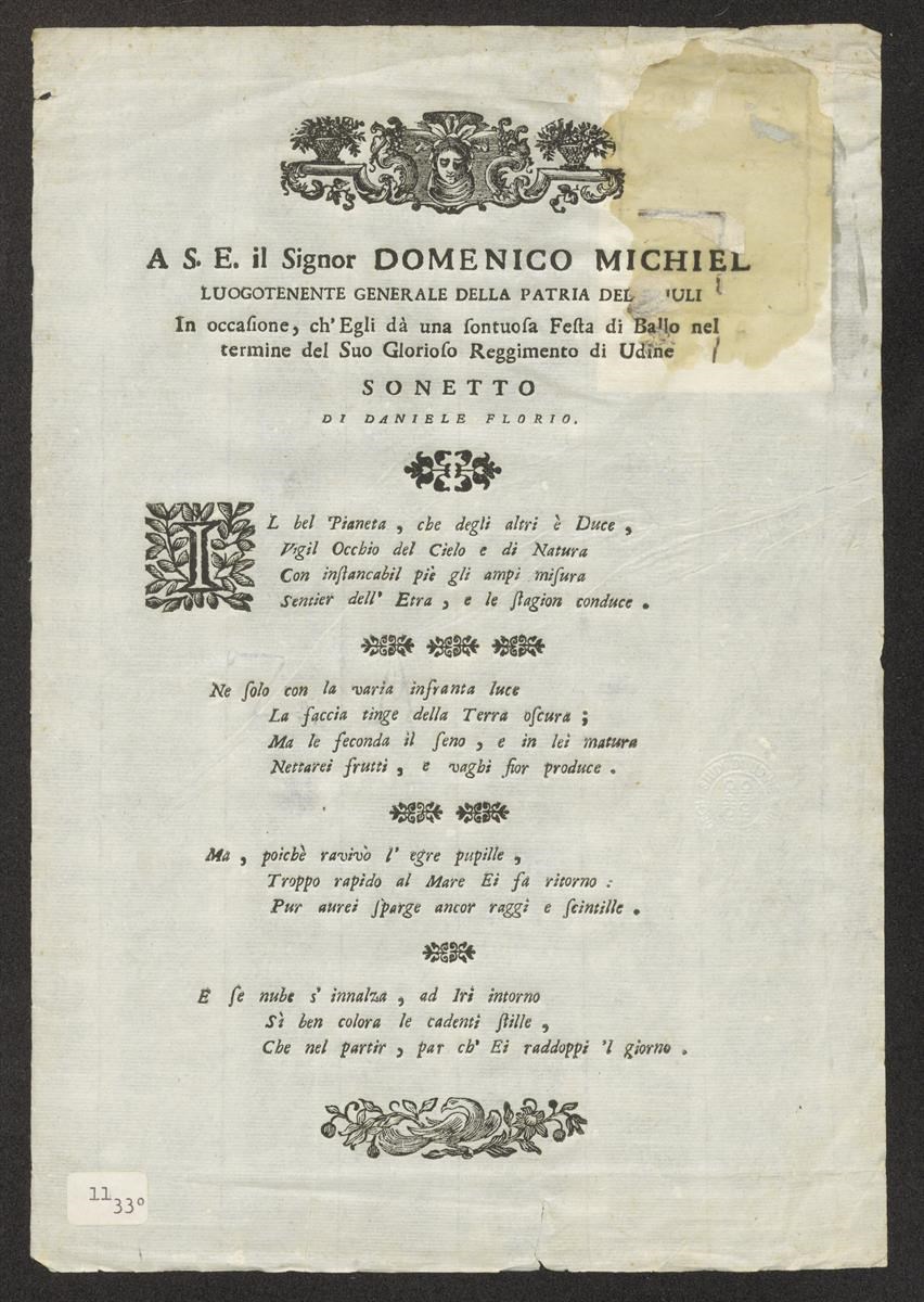 A s. e. il signor Domenico Michiel luogotenente generale della Patria del Friuli in occasione, ch'egli dà una sontuosa festa di ballo nel termine del suo glorioso reggimento di Udine sonetto di Daniele Florio