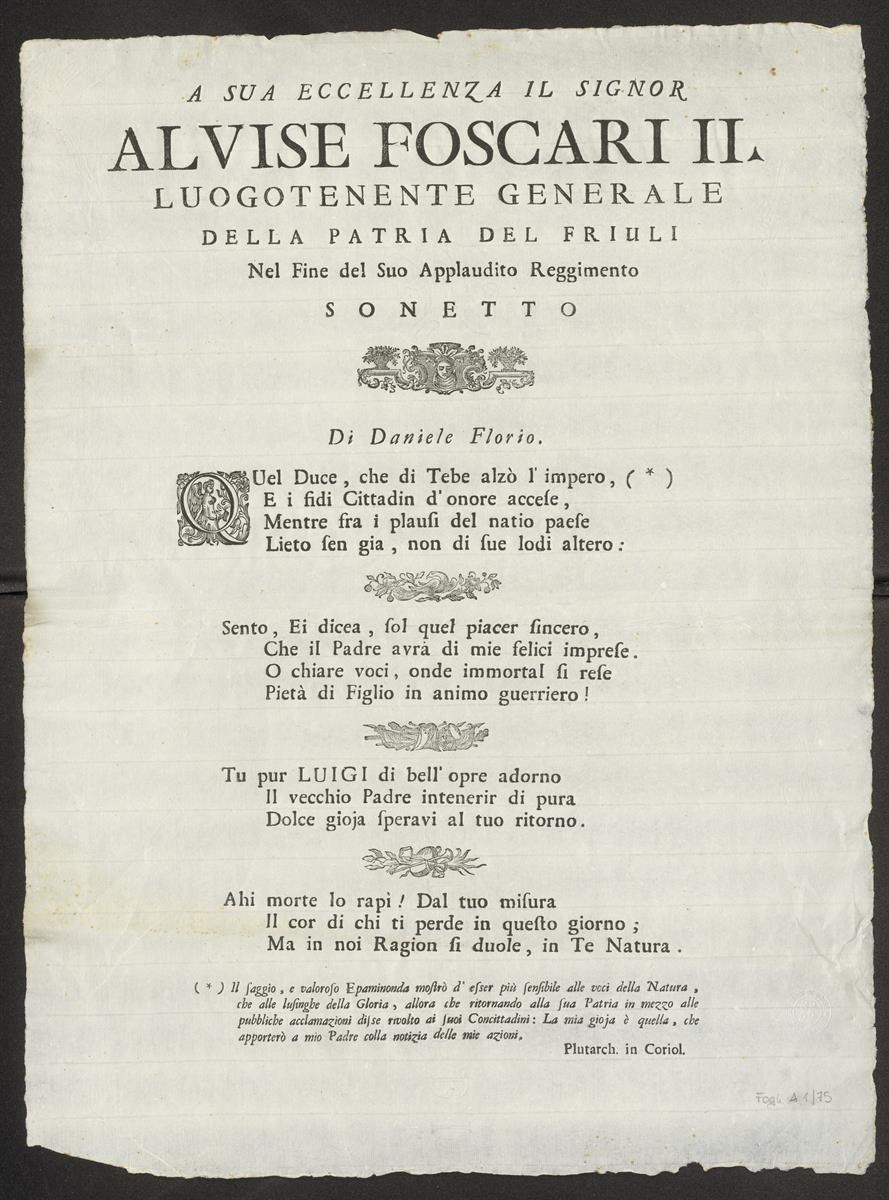 A sua eccellenza il signor Alvise Foscari II, luogotenente generale della Patria del Friuli nel fine del suo applaudito reggimento. Sonetto di Daniele Florio