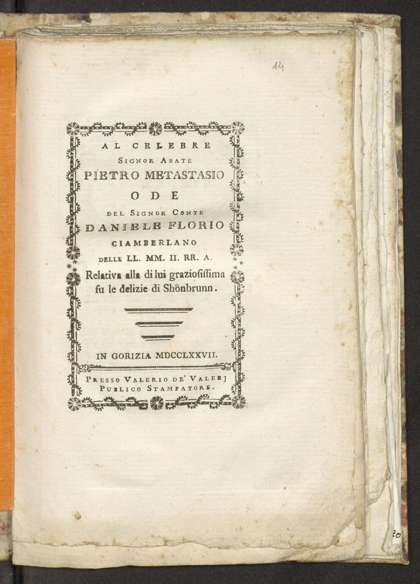 Al celebre signor abate Pietro Metastasio ode del signor conte Daniele Florio ciamberlano delle LL. MM. II. RR. A. relativa alla di lui graziosissima su le delizie di Shönbrunn