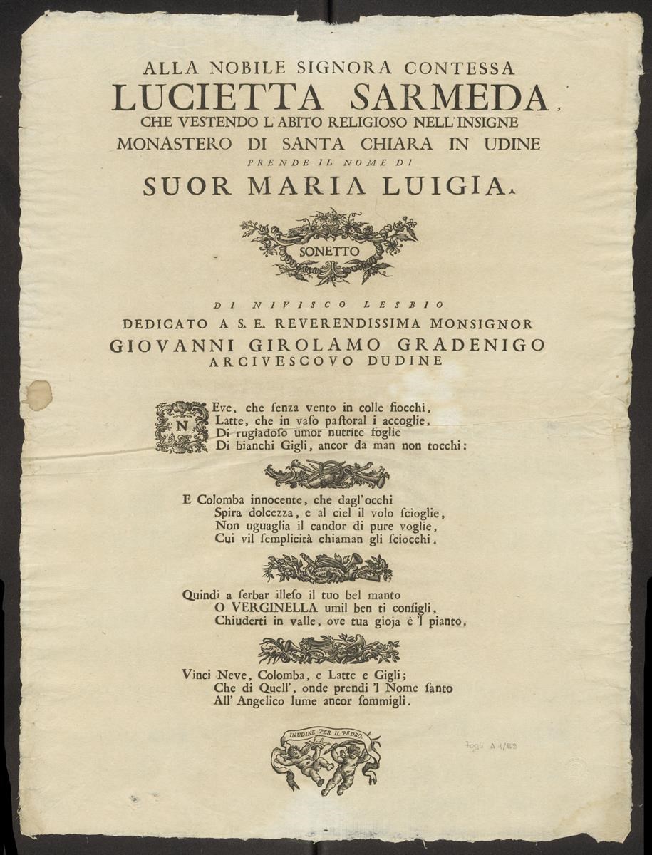 Alla nobile signora contessa Lucietta Sarmeda, che vestendo l'abito religioso nell'insigne monastero di Santa Chiara in Udine prende il nome di Suor Maria Luigia. Sonetto di Nivisco Lesbio [...]