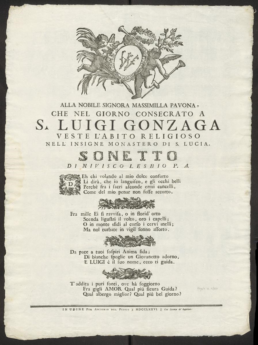 Alla nobile signora Massimilla Pavona, che nel giorno consacrato a S. Luigi Gonzaga veste l'abito religioso nel'insigne monastero di S. Lucia. Sonetto di Nivisco Lesbio