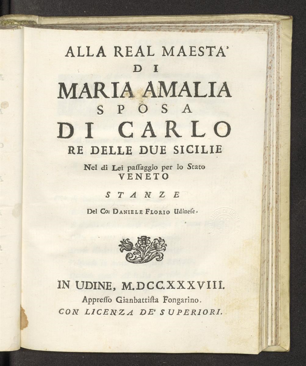Alla real maestà di Maria Amalia sposa di Carlo re delle due Sicilie nel di lei passaggio per lo Stato veneto. Stanze del co. Daniele Florio udinese
