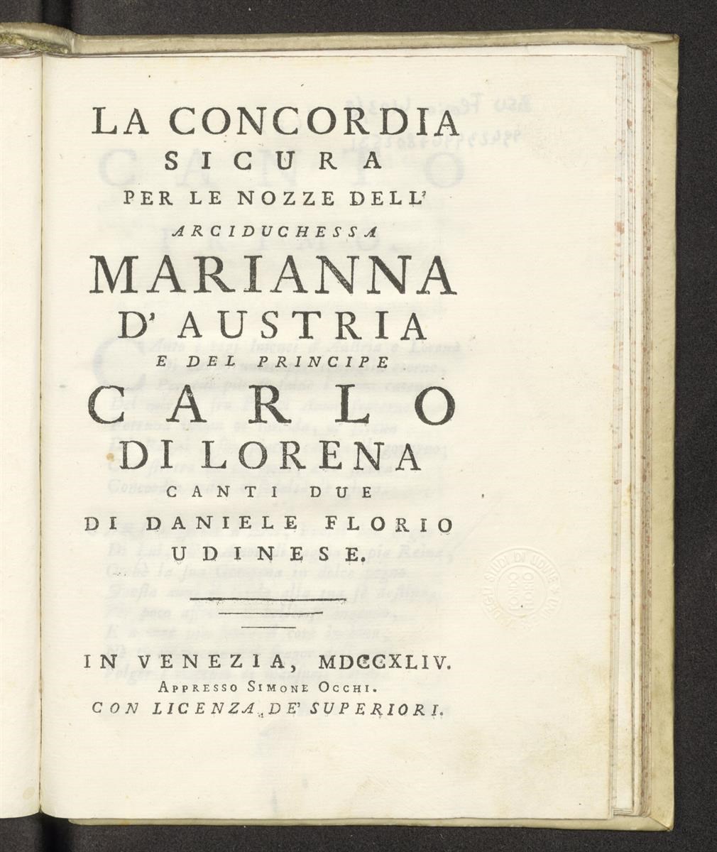 La concordia sicura per le nozze dell'arciduchessa Marianna d'Austria e del principe Carlo di Lorena. Canti due di Daniele Florio udinese