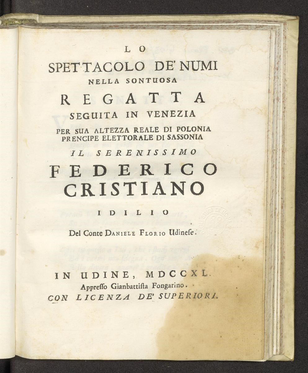 Lo spettacolo de' numi nella sontuosa regatta seguita in Venezia per sua altezza reale di Polonia prencipe elettorale di Sassonia il serenissimo Federico Cristiano. Idilio del conte Daniele Florio udinese