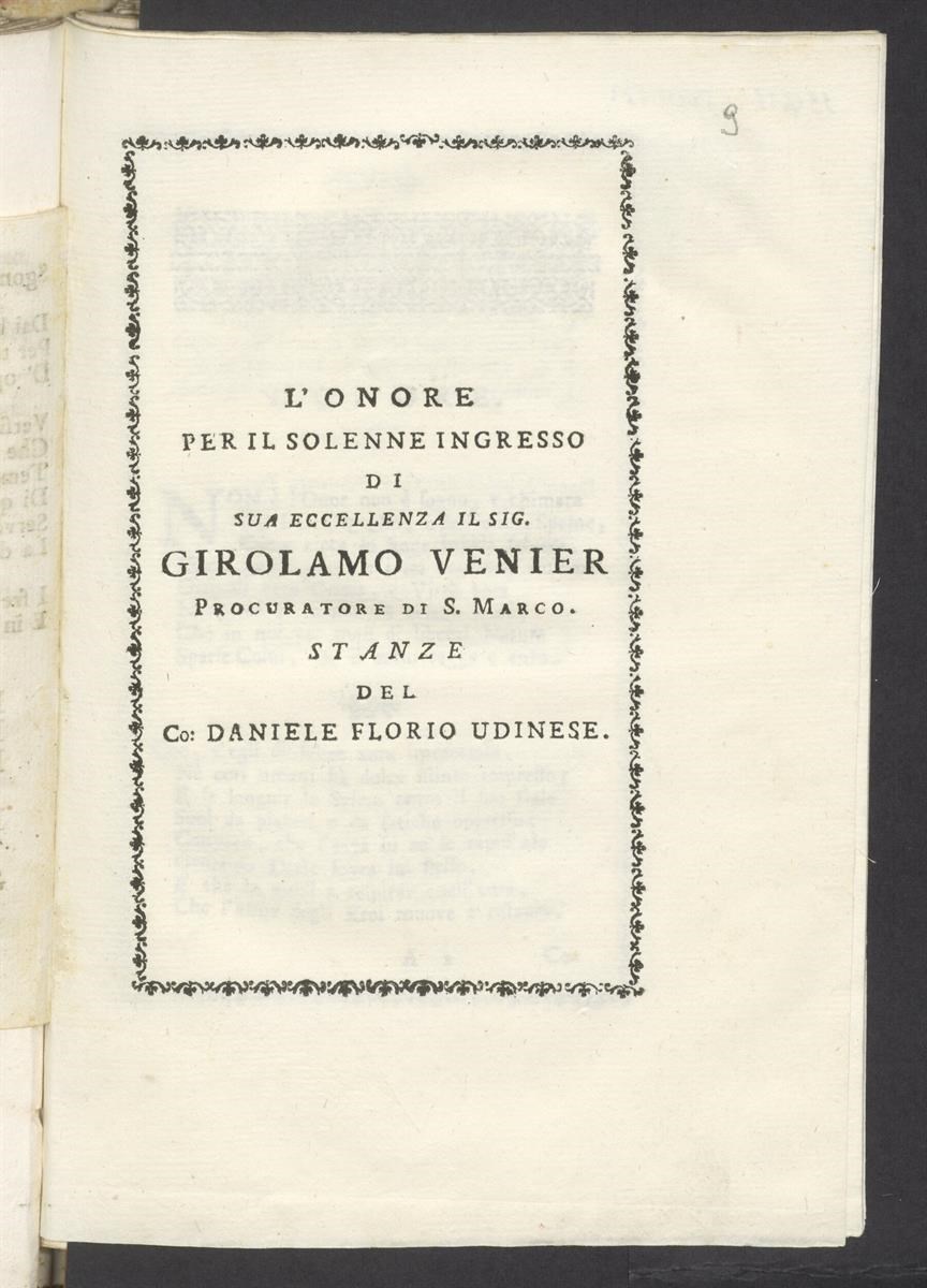 L'onore per il solenne ingresso di sua eccellenza il sig. Girolamo Venier procuratore di San Marco. Stanze del co. Daniele Florio udinese