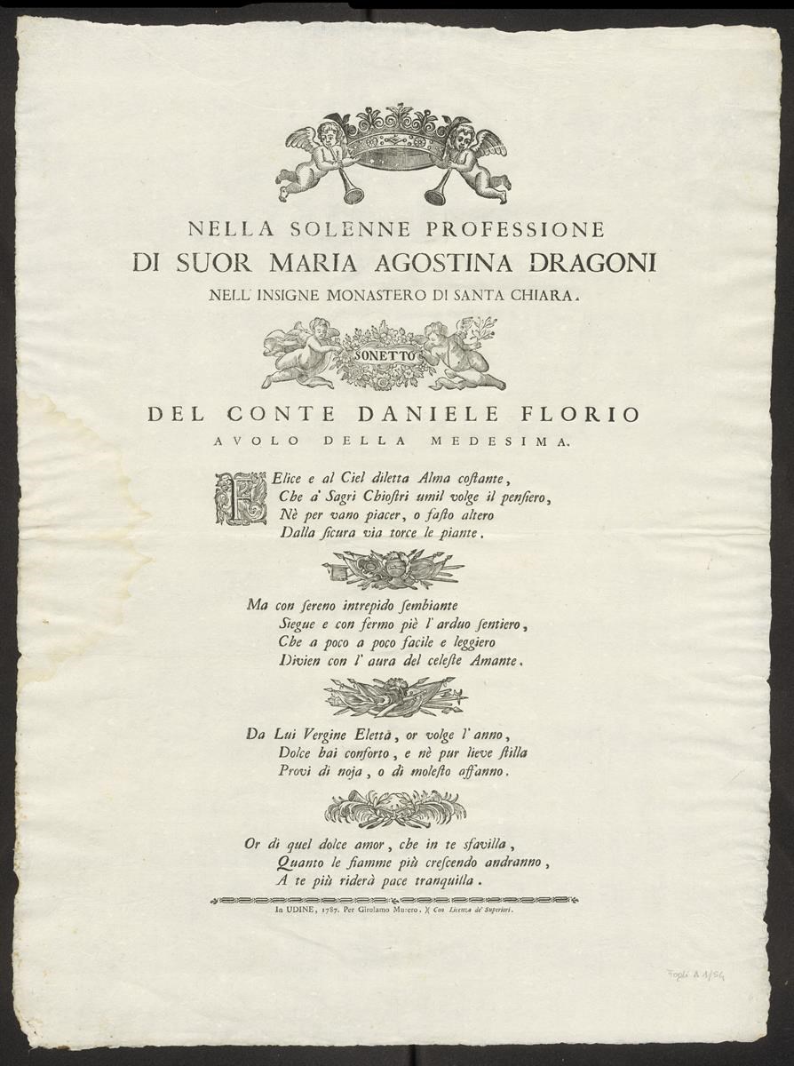 Nella solenne professione di suor Maria Agostina Dragoni nell'insigne monastero di Santa Chiara. Sonetto del conte Daniele Florio avolo della medesima.