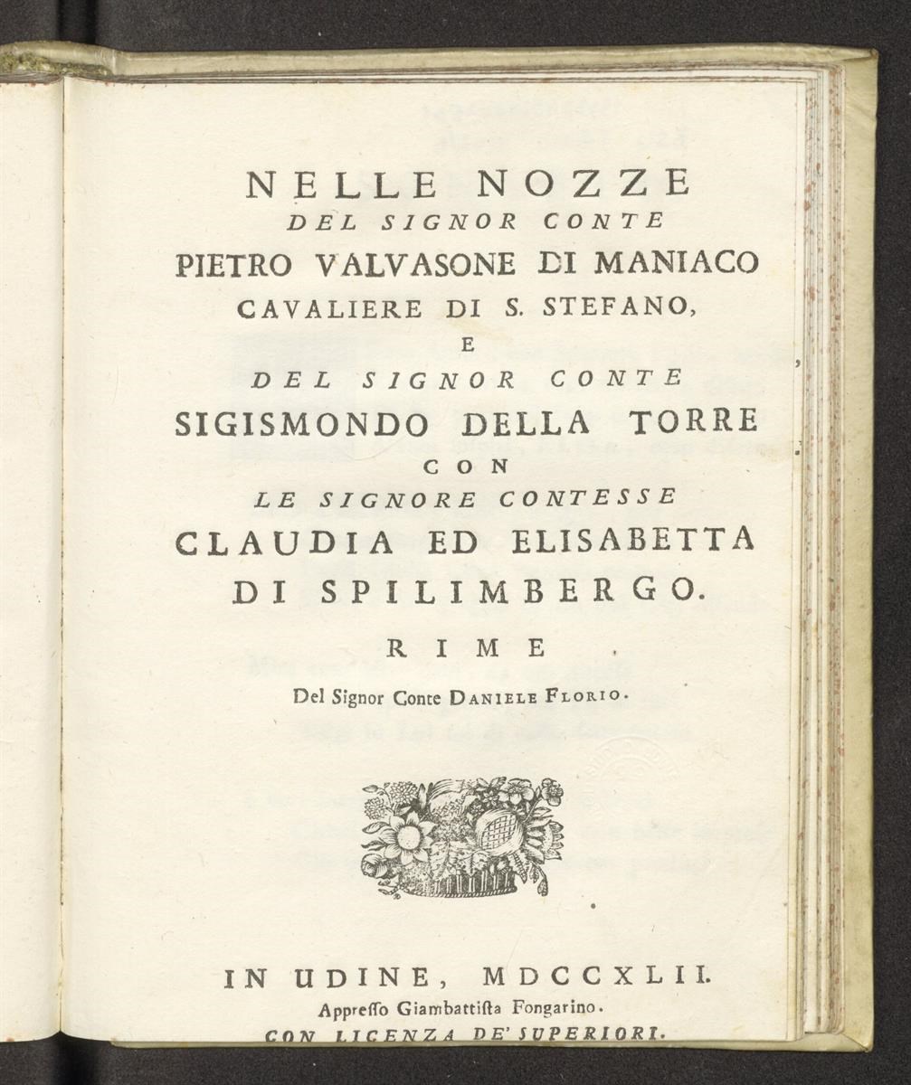 Nelle nozze del signor conte Pietro Valvasone di Maniaco cavaliere di S. Stefano, e del signor conte Sigismondo della Torre con le signore contesse Claudia ed Elisabetta di Spilimbergo. Rime del signor conte Daniele Florio