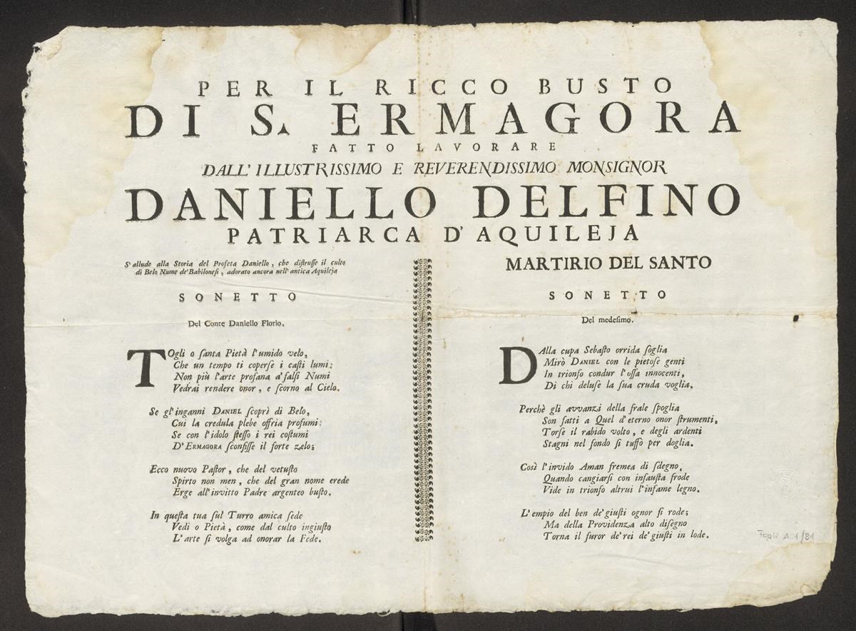 Per il ricco busto di S. Ermagora fatto lavorare dall'illustrissimo e reverendissimo monsignor Daniello Delfino patriarca d'Aquileia. [...] sonetto del conte Daniello Florio. Martirio del Santo. Sonetto del medesimo
