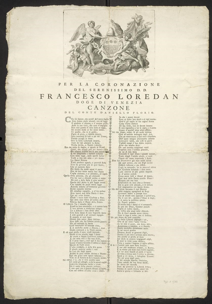 Data di stampa desunta dalla data di elezione. In testa al foglio, incisione con angeli che reggono uno scudo con lo stemma dei Loredan.
