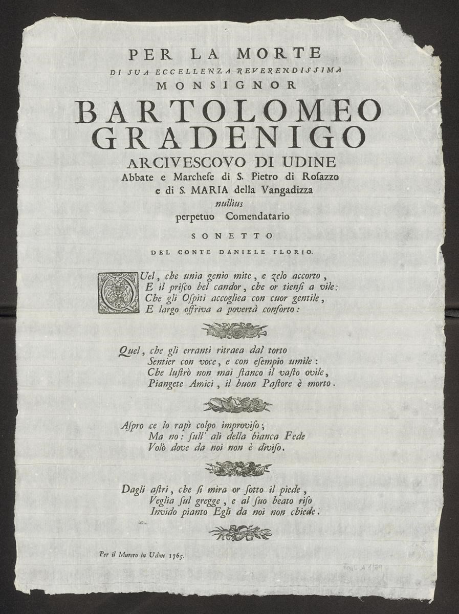 Per la morte di Sua Eccellenza reverendissima Monsignor Bartolomeo Gradenigo arcivescovo di Udine abbate e marchese di S. Pietro di Rosazza e di S. Maria della Vangadizza [...] Sonetto del conte Daniele Florio