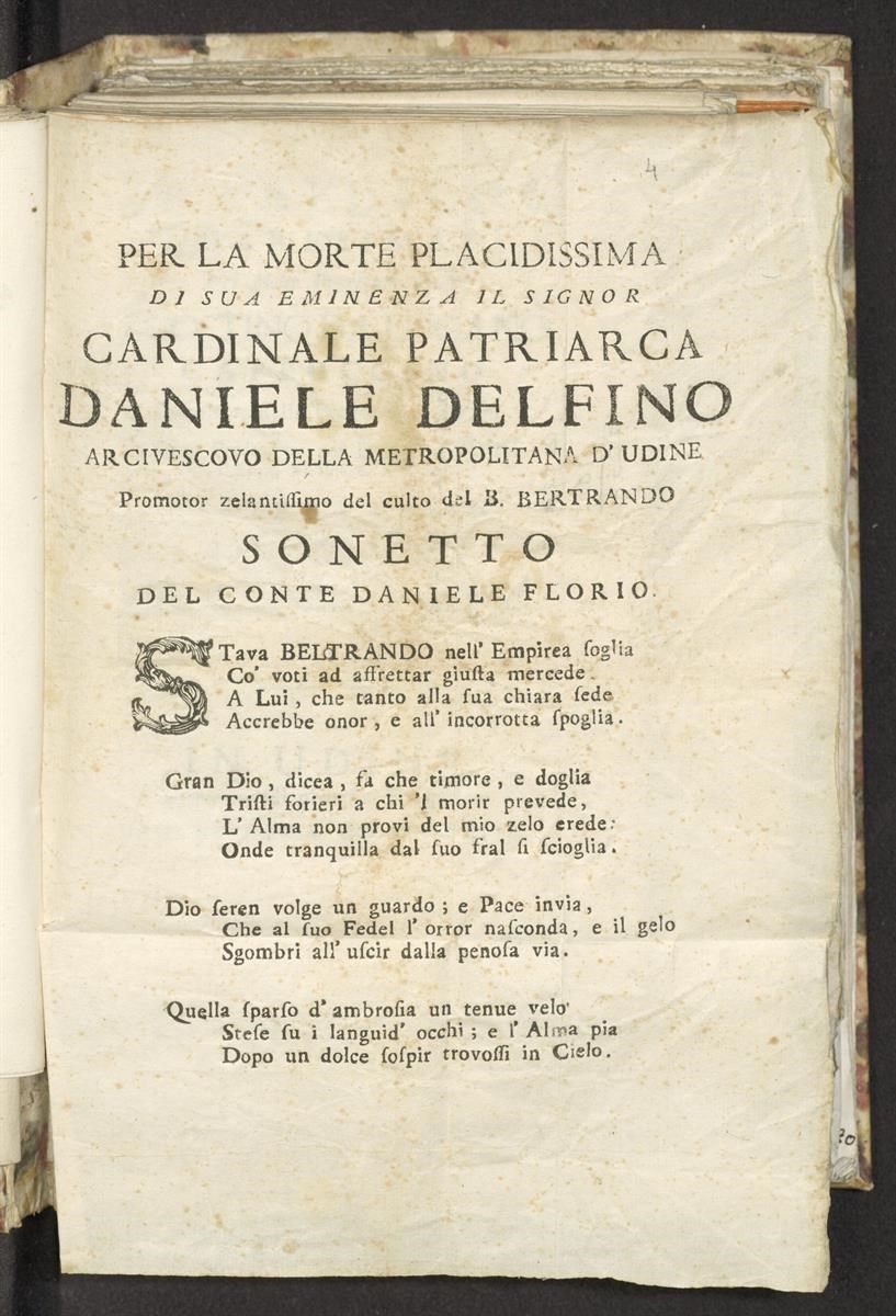 Per la morte placidissima di sua eminenza il signor cardinale patriarca Daniele Delfino arcivescovo della metropolitana d'Udine promotor zelantissimo del culto del B. Bertrando sonetto del conte Daniele Florio