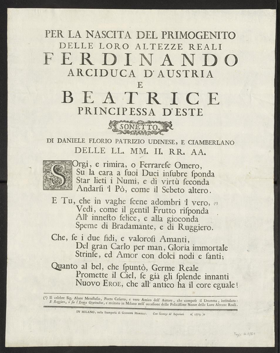 Per la nascita del primogenito delle loro Altezze Reali Ferdinando arciduca d'Austria e Beatrice principessa d'Este. Sonetto di Daniele Florio patrizio udinese, e ciamberlano delle LL.. MM. II. RR. AA.