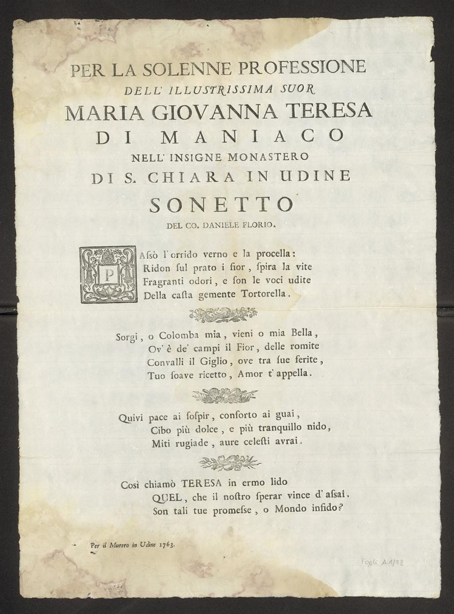 Per la solenne professione dell'illustrissima suor Maria Giovanna Teresa di Maniaco nell'insigne monastero di S. Chiara in Udine sonetto del co. Daniele Florio