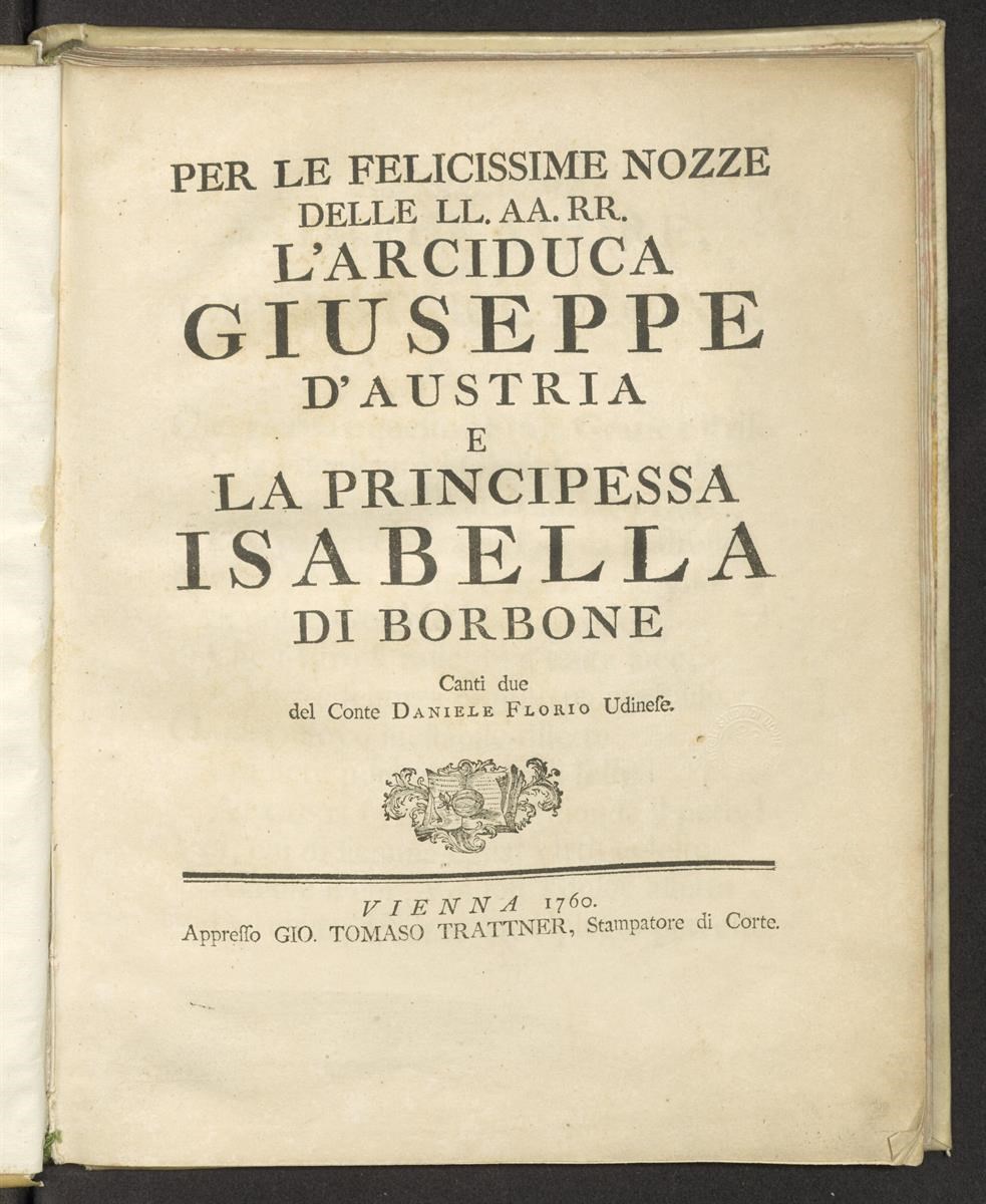 Per le felicissime nozze delle LL. AA. RR. l'arciduca Giuseppe d'Austria e la principessa Isabella di Borbone canti due del conte Daniele Florio udinese