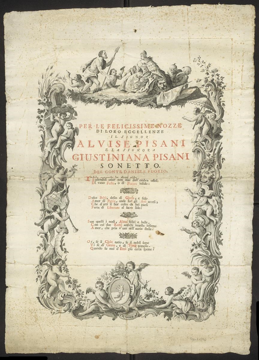 Stampa in rosso e nero. Finalini xilografici. Cornice calcografica incisa con putti e piante, ai piedi stemma della famiglia Pisani. Almorò Pisani nel 1760 sposa Giustiniana, non Alvise.