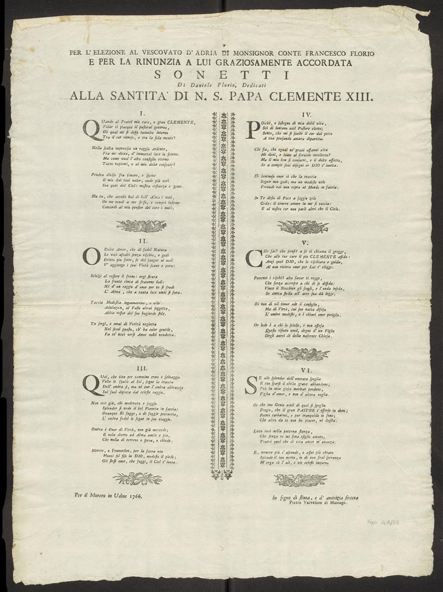Per l'elezione al vescovato d'Adria di Monsignor Conte Francesco Florio e per la rinunzia a lui graziosamente accordata Sonetti di Daniele Florio. Dedicati alla Santità di N. S. Papa Clemente XIII. In segno di stima e d'amicizia sincera Pietro Valvasone