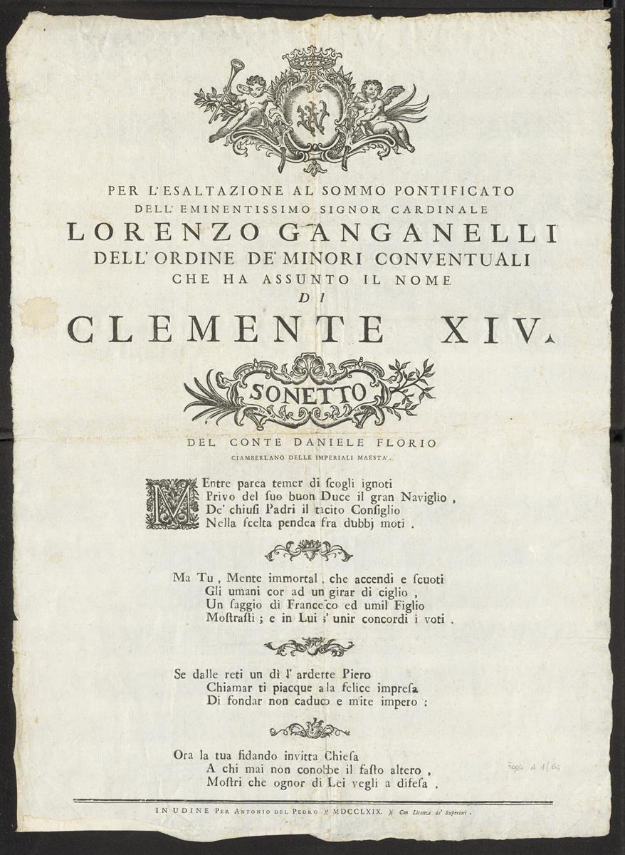 Per l'esaltazione al sommo pontificato dell'eminentissimo signor cardinale Lorenzo Ganganelli dell'ordine de' minori conventuali che ha assunto il nome di Clemente XIV. Sonetto del conte Daniele Florio ciambellano delle imperiali maestà