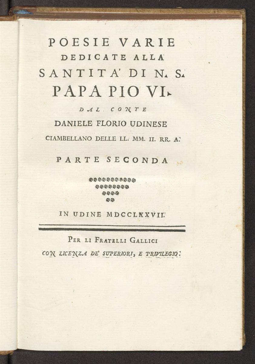 Poesie varie dedicate alla santità di N. S. papa Pio VI. dal conte Daniele Florio udinese ciambellano delle LL. MM. II. RR. A. Parte prima [-seconda]