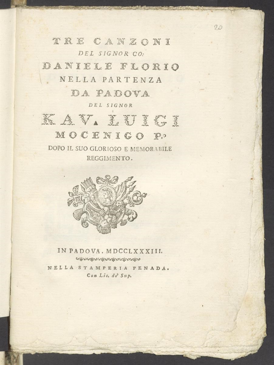 Tre canzoni del signor co. Daniele Florio nella partenza da Padova del signor kav. Luigi Mocenigo p.° dopo il suo glorioso e memorabile reggimento