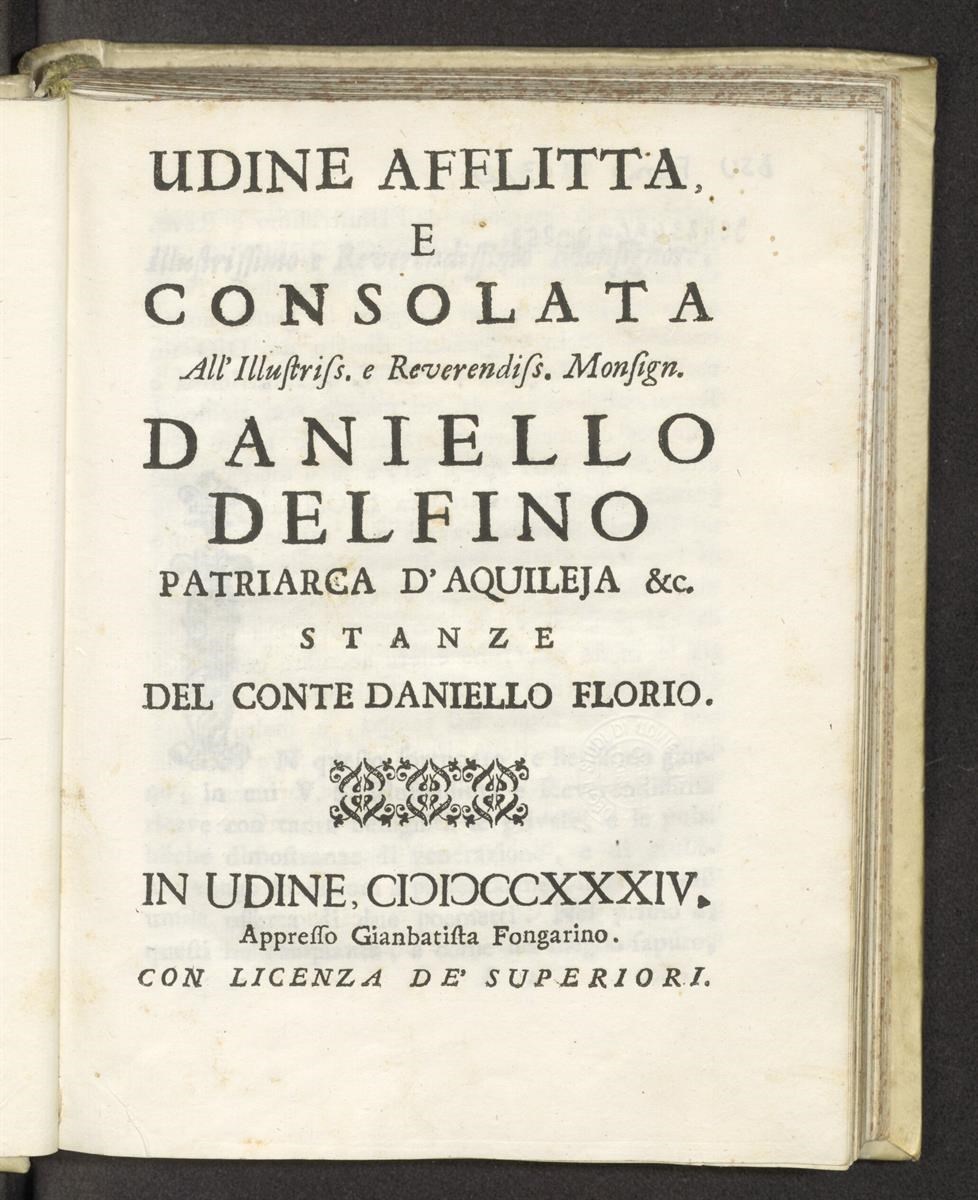 Udine afflitta, e consolata all'illustriss. e reverendiss. monsign. Daniello Delfino patriarca d'Aquileja &c. stanze del conte Daniello Florio