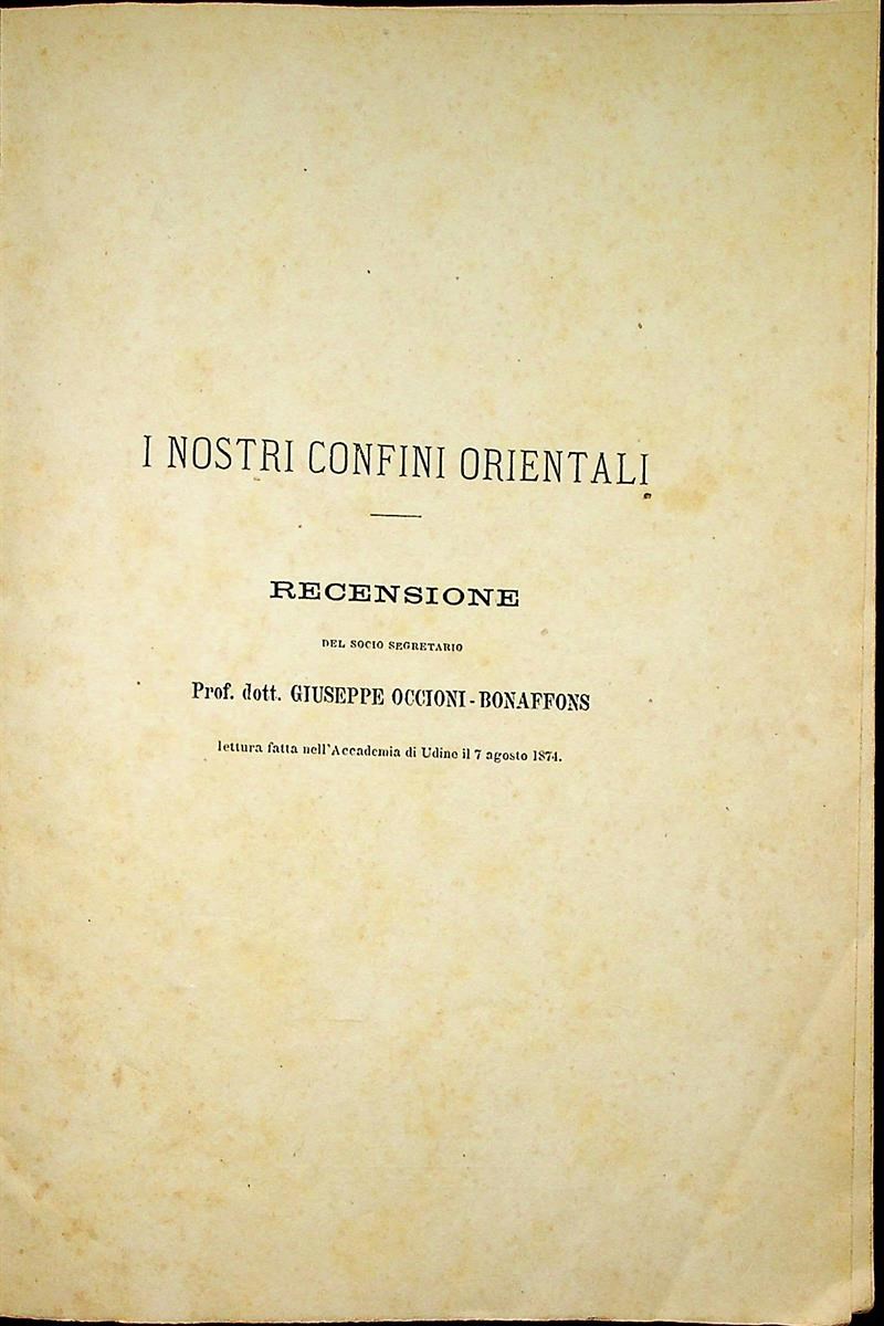 Sul valore degli archivi, infine, quali strumenti per «somministrarci le fonti storiche meglio accreditate» e sulla mancanza di giustificazione etnica, linguistica, culturale, geografica e strategico-militare della secolare divisione del Friuli in due parti – una inclusa nel Veneto e l’altra negli Stati ereditari degli Asburgo – si esprime Prospero Antonini nel suo Del Friuli ed in particolare dei trattati da cui ebbe origine la dualità politica di questa regione (1873). Su quest'opera ha scritto un'accurata recensione Occioni Bonaffons (I nostri confini orientali: lettura fatta nell'Accademia di Udine il 7 agosto 1874: vedi digitalizzazione).